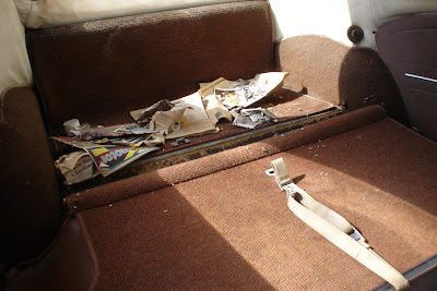 A thesamba-n találtam ezt a jó kis eredeti, perecbe való kárpitgarnitúrát két héttel ezelőtt. Ma meg is érkezett Lengyelországból, de még nem tudtam kibontani. (Nem szeretném a lakásba felhozni, ahol a kéthónapos Barnus is lakik.) nagyon izgatott vagyok, holnap reggel feltépem a dobozt a műhelyben!